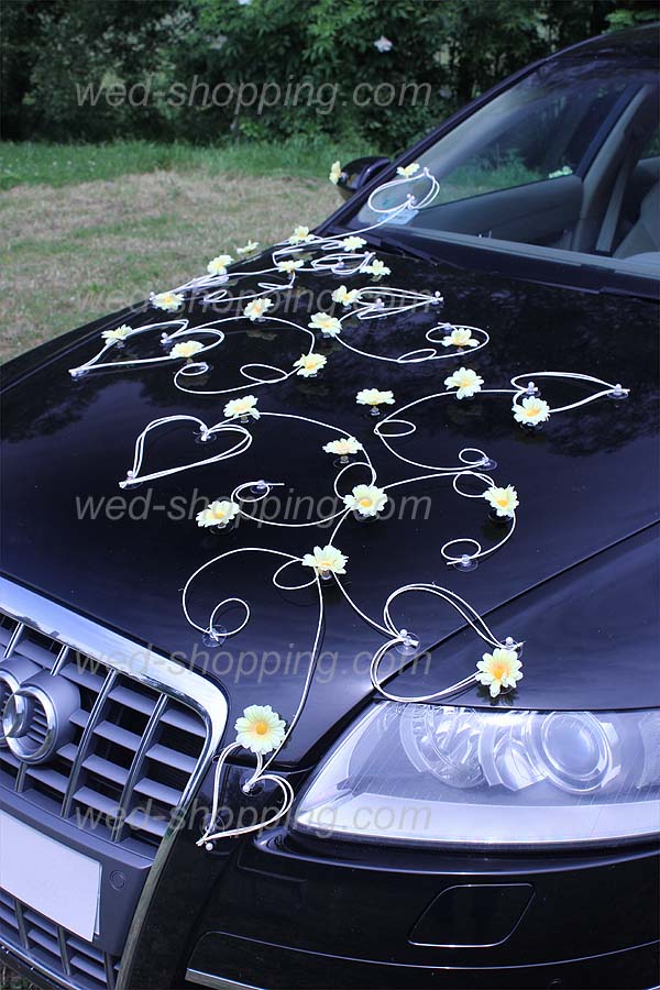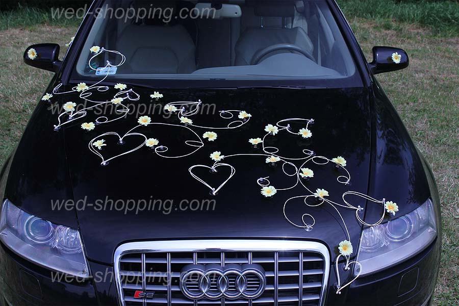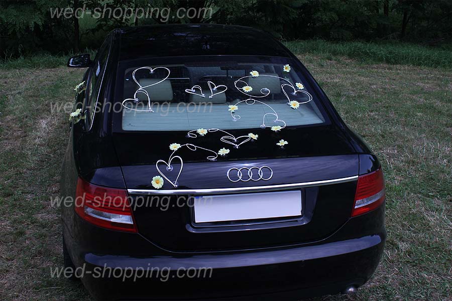 Joukko koriste koostuu: 12 rottinki oksia yhdessä kaikenkokoiset sydämet - koristeltu helmiä 28 koiranputkea auton eteen 12 koiranputkea auton sivuttain (3 jokaisen oven) 10 koiranputkea takana auton. Koko sisustus on kiinnitetty imukupit, jotka ovat turvallisia maali. Saatavana myös koiranputkea värit: valkoinen, oranssi ja kerma.