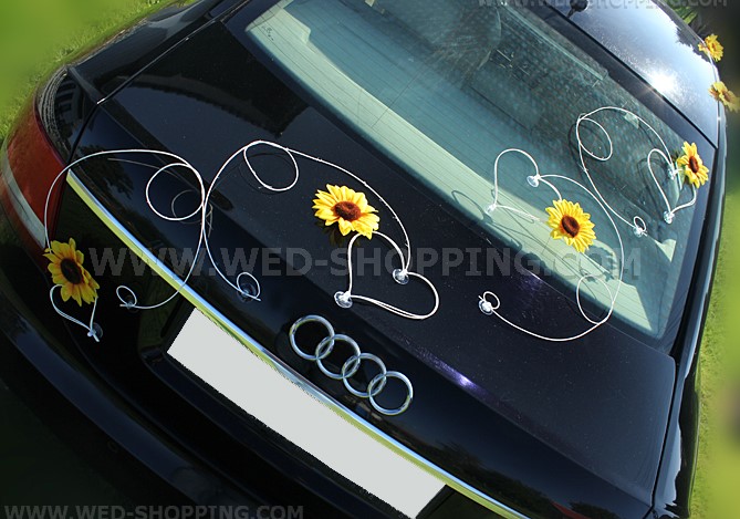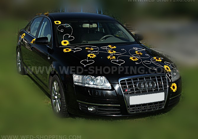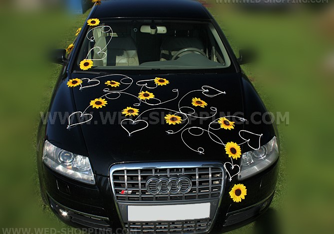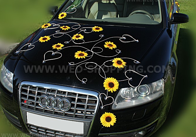 Joukko koriste koostuu: 24 auringonkukat (edessä, takana ja sivuilla auto) 12 rottinki oksia päätökseen sydämet. Sisustus Kuvissa on vain ehdotus ja saa vapaasti noudattaen. Sisustus on asennettu imukupit, jotka ovat turvallisia maali.