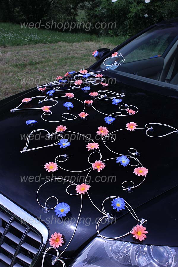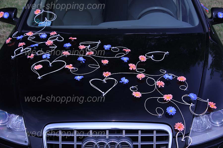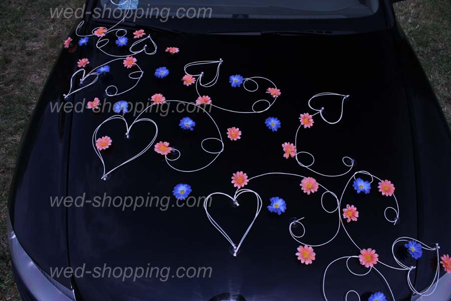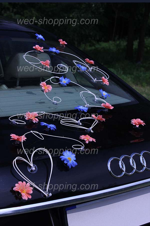 Joukko koriste koostuu: 12 rottinki oksia yhdessä kaikenkokoiset sydämet - koristeltu helmiä 28 koiranputkea auton eteen 12 koiranputkea auton sivuttain (3 jokaisen oven) 10 koiranputkea takana auton. Lisäksi 25 koiranputkea toinen väri Koko sisustus on kiinnitetty imukupit, jotka ovat turvallisia maali. Saatavana myös koiranputkea värit: valkoinen, oranssi ja kerma.