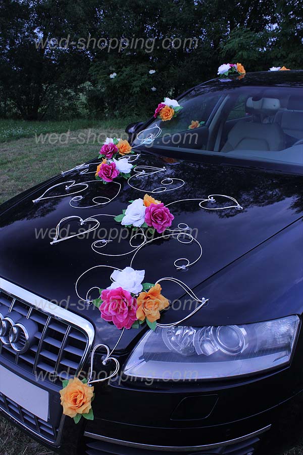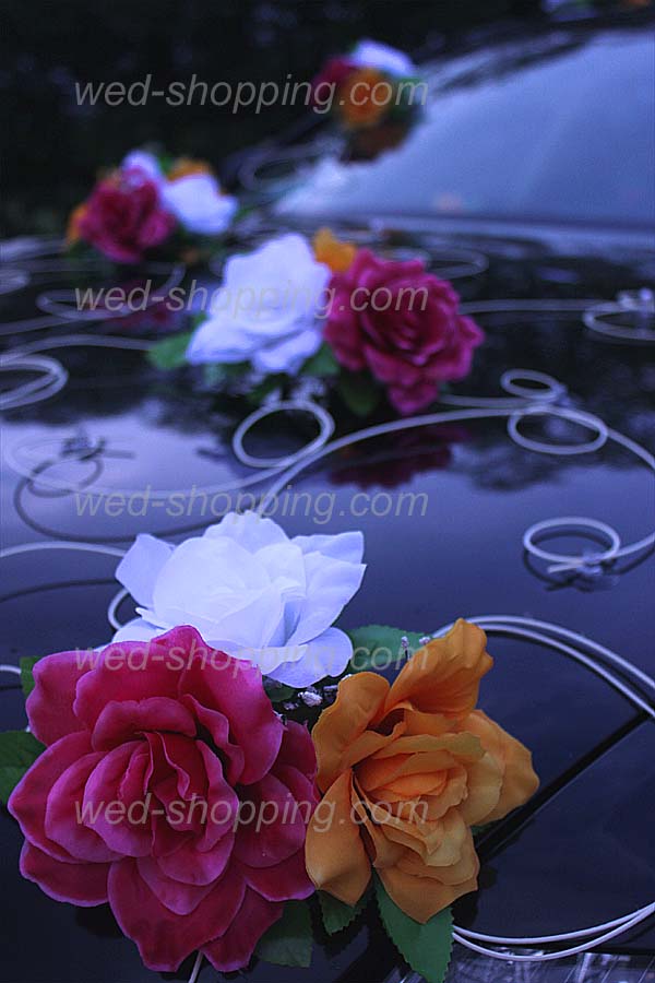 Häät auton koristeluun: - 10 kimpussa kolme ruusua - 5 ylimääräistä kukkia oven ja / tai puskurin - 12 rottinki oksia sydämen motiivi, koristeltu helmin Kuvissa vain ehdotuksen, jossa sisustus. Kukkakimput katolla voit siirtää huppu auton. Sisustus asennettu imukupin - turvallinen auton maalipintaan.