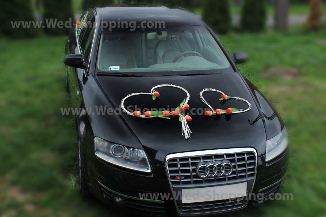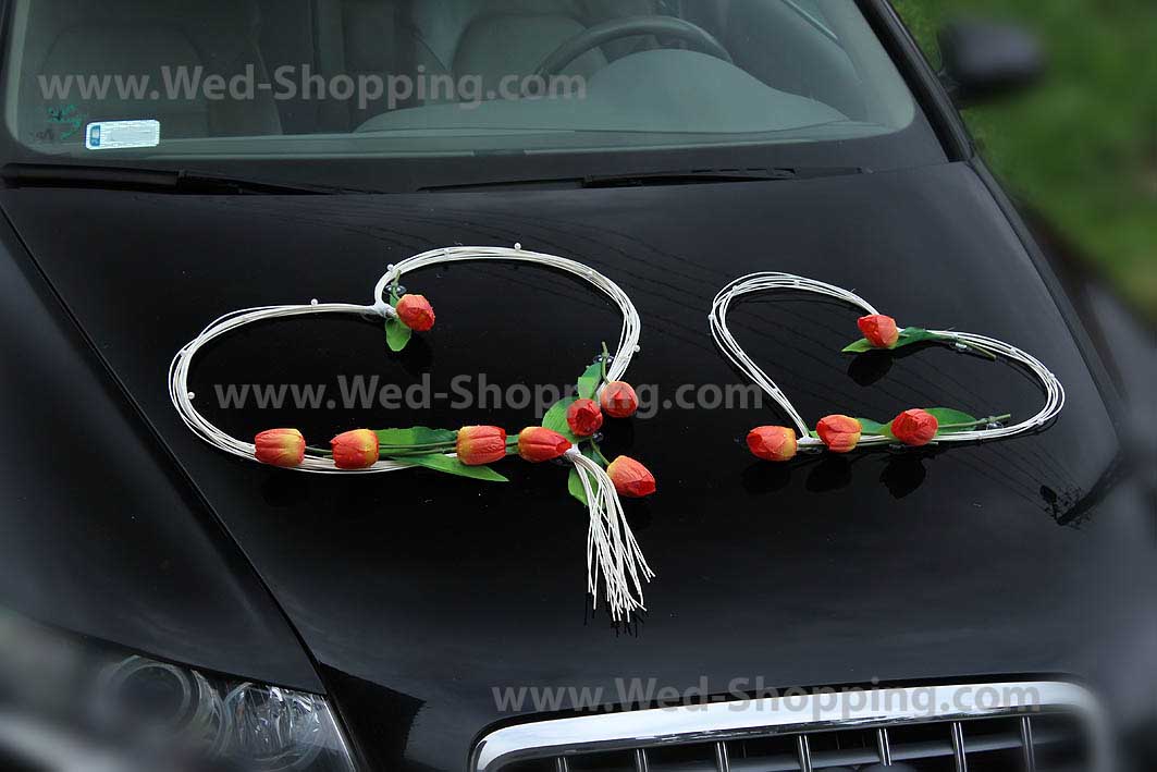 Etusivu » Hääkoristeet » Hääauton koristelu » Kunniamerkki häät auto kelta-oranssi tulppaanit kunstbloemen