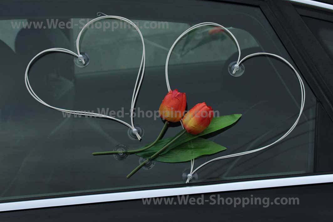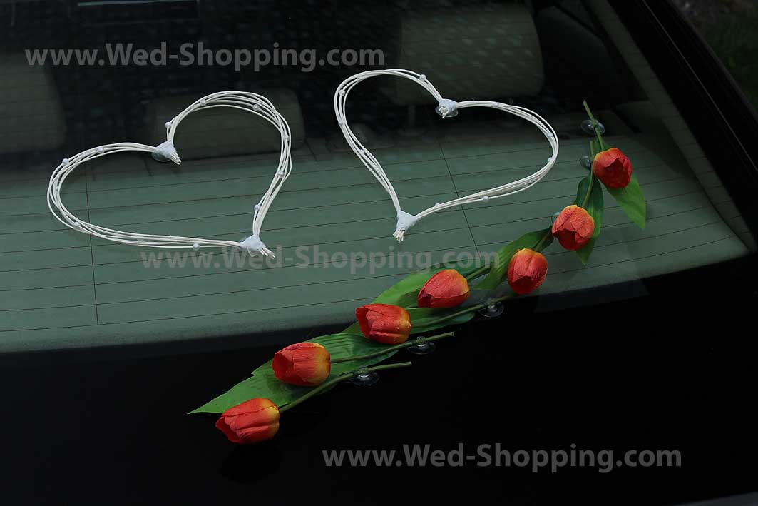 Ainutlaatuinen sisustus autoosi. 2 isoa sydämet koristeltu helmin (asennettu imukupin) 2 sydämiä takaisin lasi - helmiä (imukupilla) 4 sydämiä puolin auton (imukupilla) Joukko tulppaanit imukupilla. Kaikki koristelu on kiinnitetty imukuppi. Imukupit eivät vahingoita auton maali ja tiukasti kiinni koristelu. Sisustus on turvallinen auton maaliin.